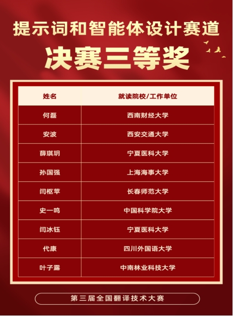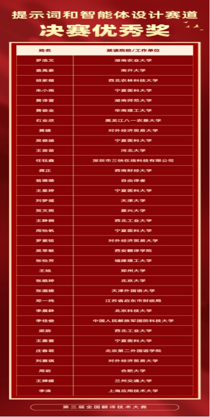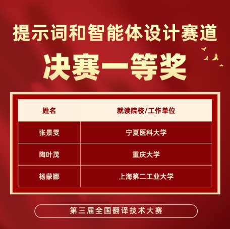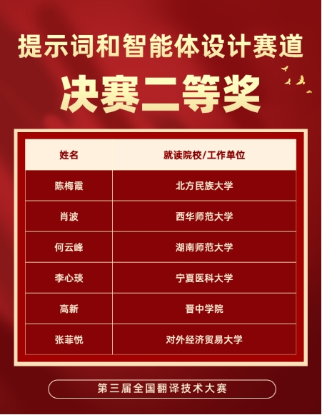 9月20日,由中国外文局、全国翻译专业学位研究生教育指导委员会指导,中国翻译协会、中国外文局翻译院、天津外国语大学联合主办的第三届全国翻译技术大赛落下帷幕。我校师生凭借扎实的专业功底、创新的技术应用能力和出色的现场发挥,在大赛中脱颖而出,荣获翻译技术教学赛道二等奖1项,提示词和智能体设计赛道一等奖1项、二等奖1项、三等奖2项、优秀奖5项。
