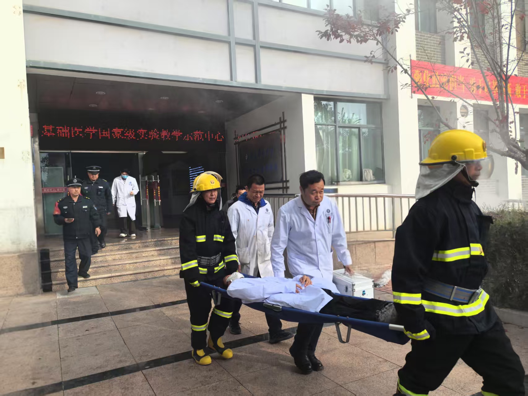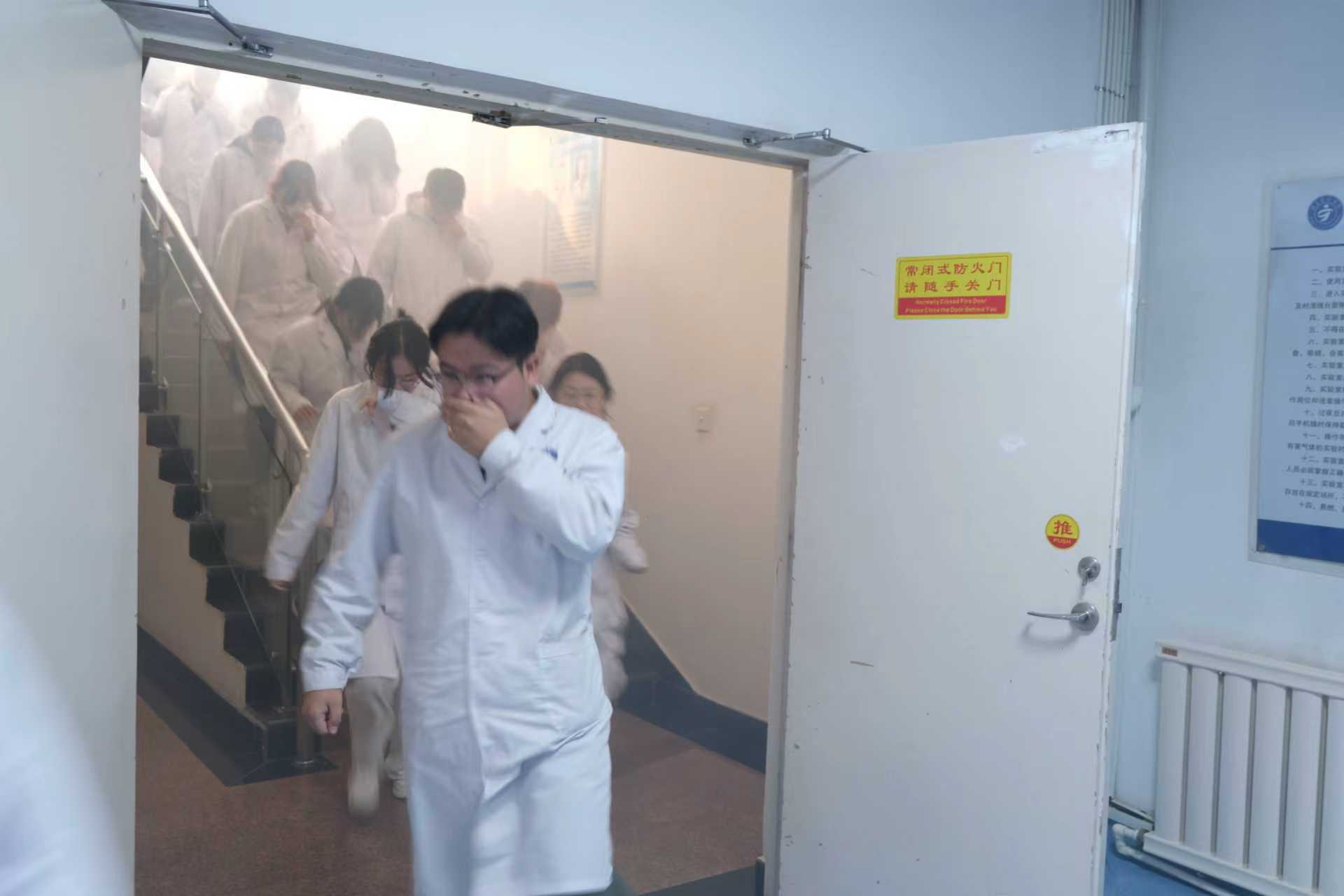 演练高度还原真实火情场景,所在楼宇全体师生严密捂住口鼻,保持弯腰低姿,沿就近消防楼梯,按照指定疏散路线,快速有序撤离至楼外安全区域。撤离后,工作人员立即清点人数,同步对“受伤人员”开展急救处置,并组织人员使用消防器材开展灭火,整个流程衔接紧密、分工明确。