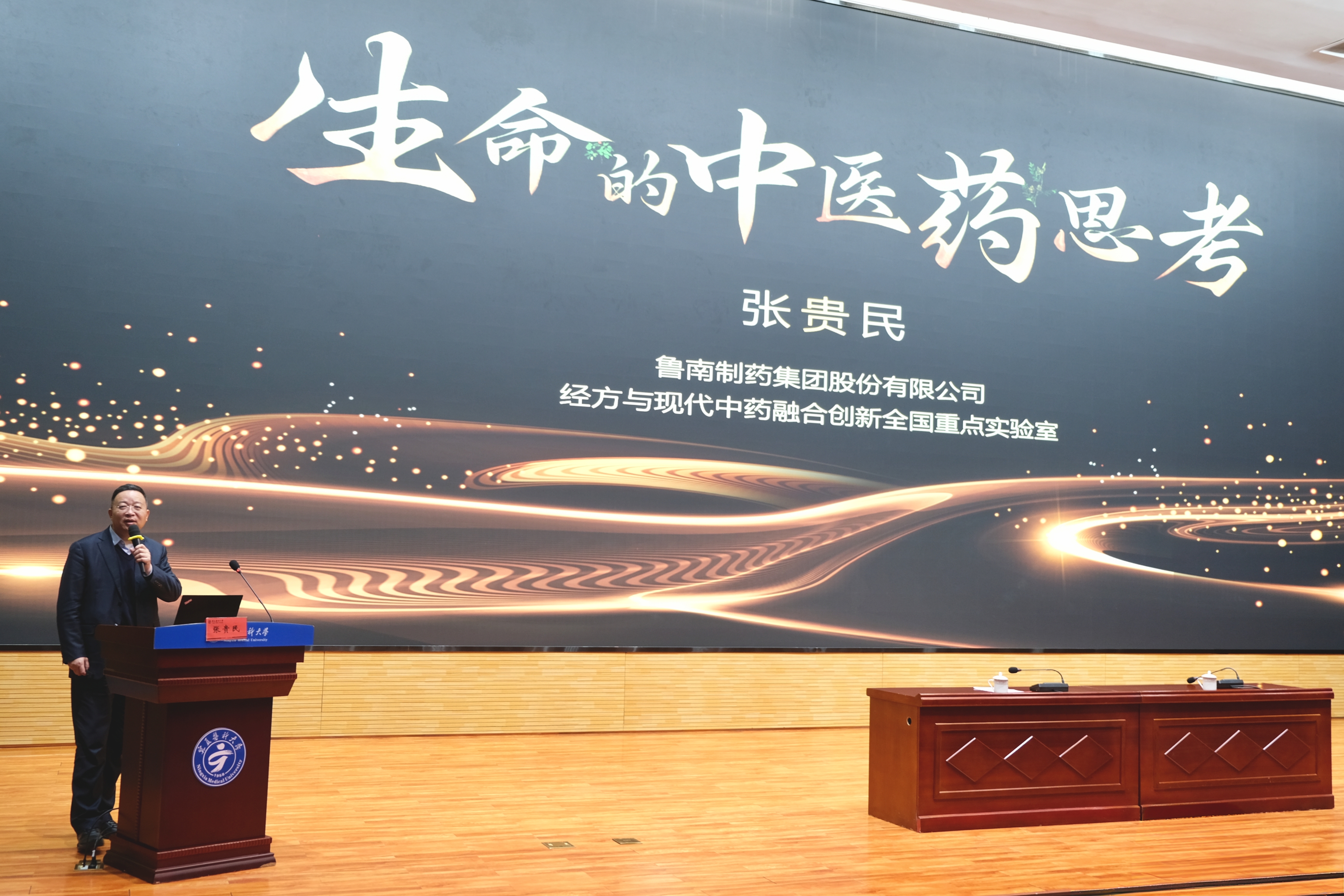 论坛特邀鲁南制药集团股份有限公司党委书记、董事长、总经理、经方与现代中药融合创新全国重点实验室主任张贵民为参与人员作了题为《生命的中医药思考》的报告。他基于《老子》《黄帝内经》等经典,系统阐释了中医药“天人合一、正气为本”的核心理念与健康观,介绍了荆防颗粒抗衰老免疫调节、首荟通便护肠道的研究成果,阐释了中医药“整体平衡、多向调节”的独特优势。在互动交流环节,与会师生围绕“中药产业人才需求方向、科研成果转化路径”等问题与张贵民老师深入探讨,为师生搭建理论与产业实践的桥梁。