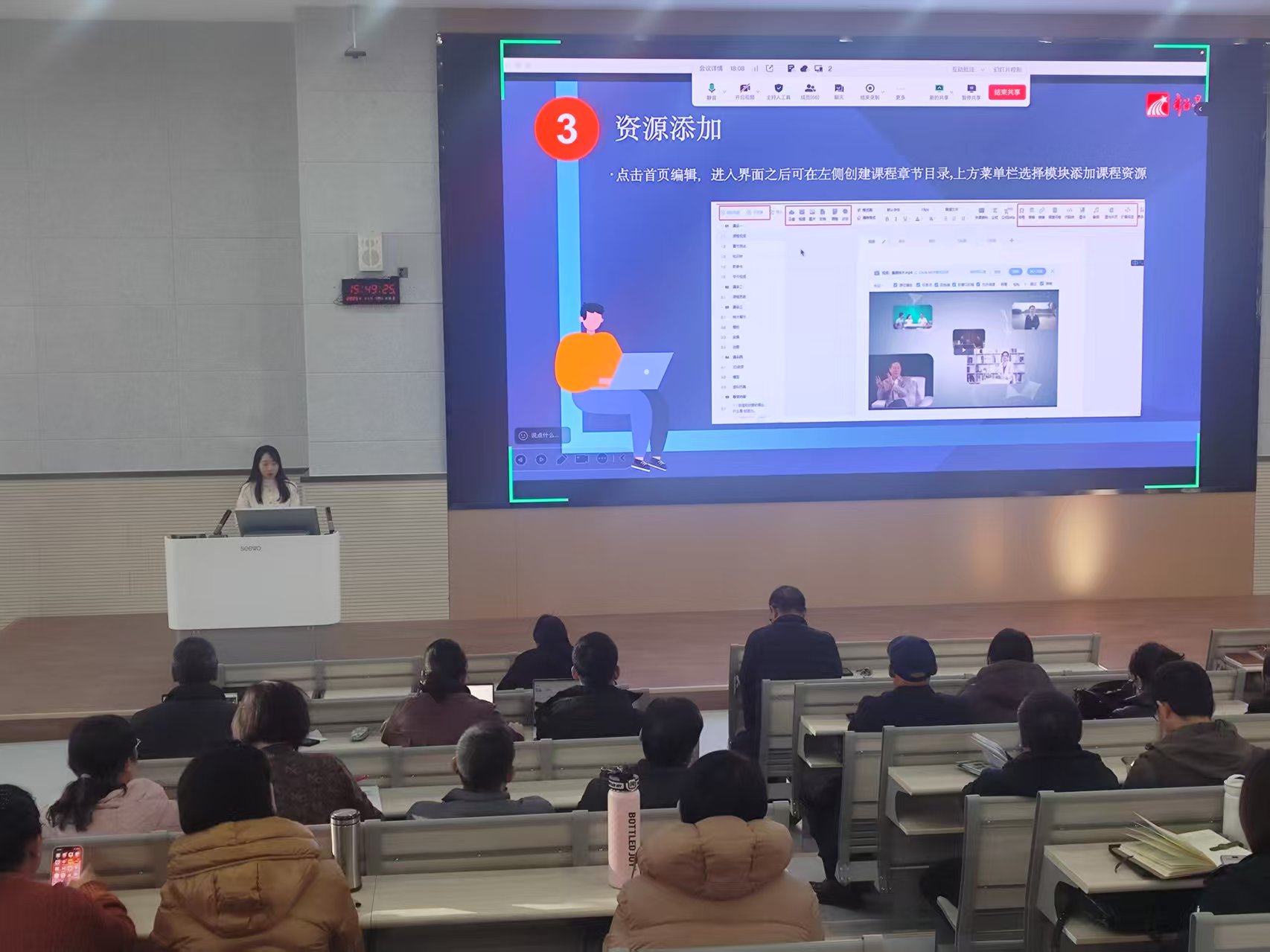 为贯彻落实学校智慧教学一体化平台建设与应用推进工作会精神,深入推进信息技术与教育教学深度融合,提升教师数字素养与智慧教学平台应用能力,加快推动平台全员应用与深度融合,11月19日下午,由教务处组织的“智慧教学平台使用培训(第一期)”在新建成的砺行楼智慧教室顺利举行。本次培训采用“线下+线上”同步方式进行,各教学单位负责人、国家级及自治区级一流课程负责人、一线教师及教学管理人员等参加培训。