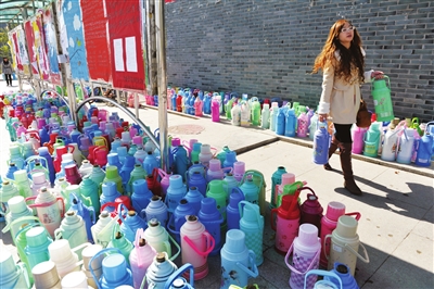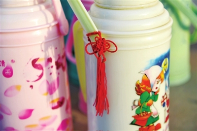 这样的风景线每天上午和下午各出现一次,每次都有数百个暖水瓶出现在广场上,多的时候达上千个,甚是壮观。虽然暖水瓶花花绿绿,但数百个暖水瓶放在一起,难免有分不清拿错丢失的事情发生。管理学院的张荣同学坦言,她帮舍友提暖水瓶时就拿错了,只好赶快跑着送了回去。为防止暖水瓶被错拿,学生们在各自的暖水瓶标上各具特色的记号,或画上一个可爱的图案,或写上一段雷人的诗句……