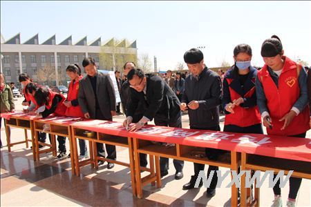 仪式中,学校团委马立虎副书记号召全体宁医师生坚定信念、爱党爱国,做青年网络文明志愿者,自觉抵御网上不良信息,积极传递正能量,为营造健康文明、诚信和谐的社会网络环境贡献宁医人的“心”力量。学校五星级志愿者马晶晶同学向全校同学发出《清朗网络•青年力量》倡议,希望全校同学积极加入到青年网络文明志愿行动中来,不做置身事外的旁观者,做勇于担当的生力军,在网上积极发出青年好声音、携手共筑绿色网络屏障。参加仪式的所有师生都在倡议横幅上签名,踊跃加入到网络文明志愿行动的队伍中。
