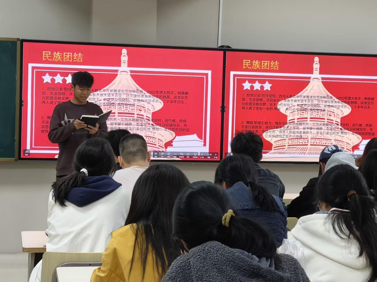 本次主题团日活动紧扣“青春”与“团结”两大核心,打造沉浸式、互动式教育场景。主持人吴怡欣与团员结合党史与民族发展史,分享身边民族团结的真人真事。之后,全体同学赴学校铸牢中华民族共同体意识教育实践基地参观,“红石榴”宣讲团成员生动讲解了民族团结发展的历史进程。同学们沉浸其中,积极与宣讲团成员交流互动,同时也分享了发生在自己身边的故事。